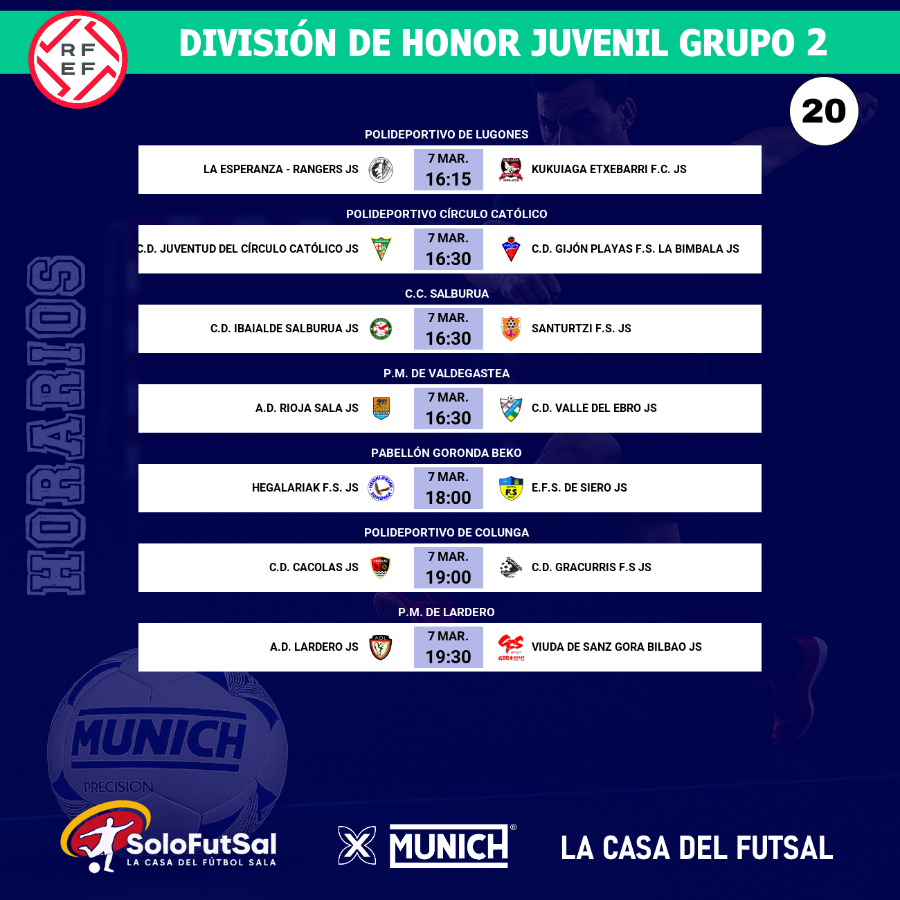 La participación asturiana en esta vigésima jornada se cerrará a las 19:00 horas en el Polideportivo de Colunga, escenario del que se perfila como el duelo más desequilibrado sobre el papel: el C.D. Cacolas recibe al líder absoluto, el C.D. Gracurris F.S.. La situación del conjunto local es crítica; son colistas de la categoría con apenas 4 puntos y un doloroso balance de 142 goles en contra. Condenados a una huida hacia adelante para evitar el descenso a la Liga Territorial, los asturianos vienen de encadenar derrotas ante rivales como el Otxartabe C.D. (4-6) y el Hegalariak F.S. (5-1).