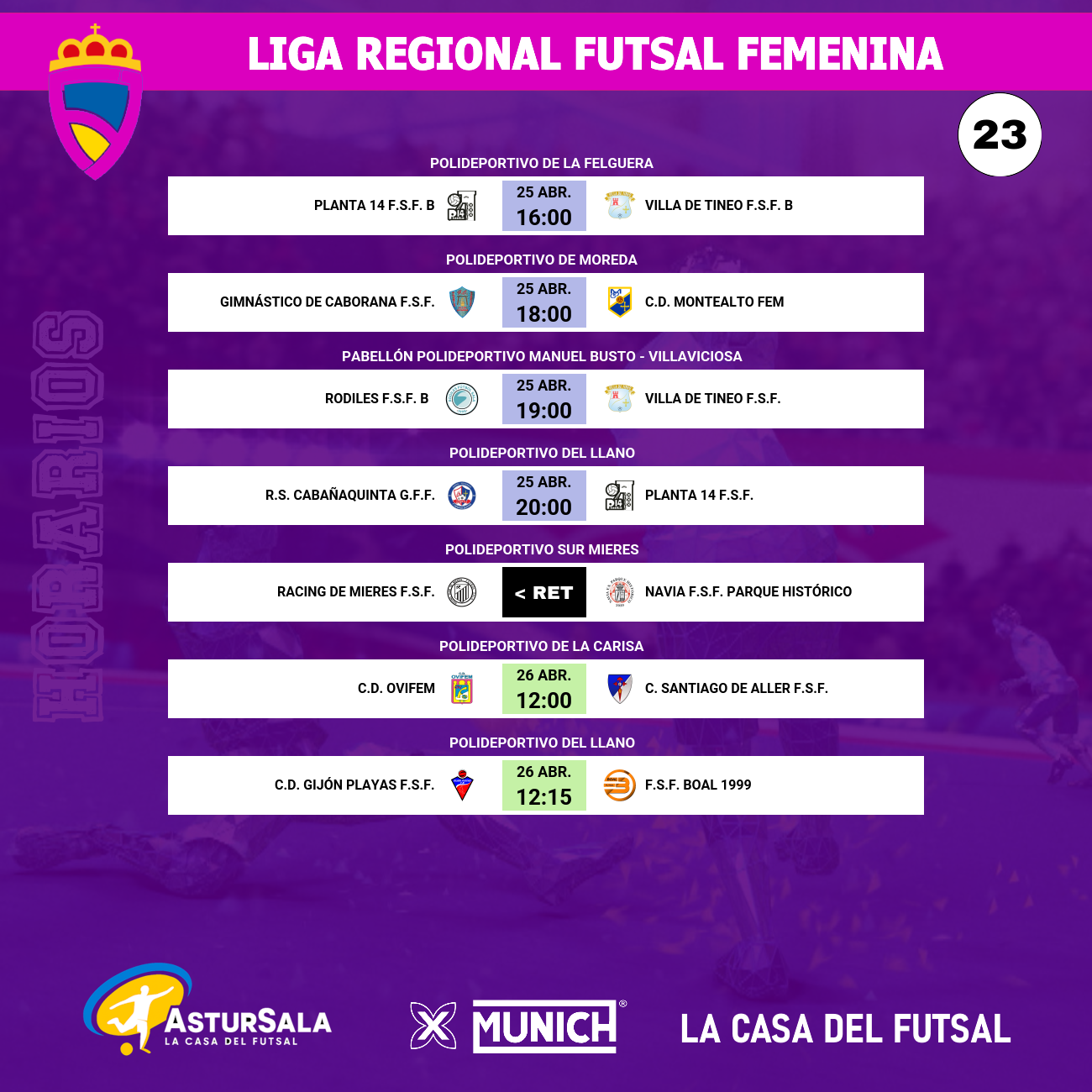 Finalmente, la jornada se inaugurará el sábado a las 16:00 horas en el Polideportivo de La Felguera con el encuentro que medirá al Planta 14 F.S.F. B frente al Villa de Tineo F.S.F. B. Este duelo entre filiales (duodécimo contra undécimo) representa una excelente oportunidad para el desarrollo formativo.