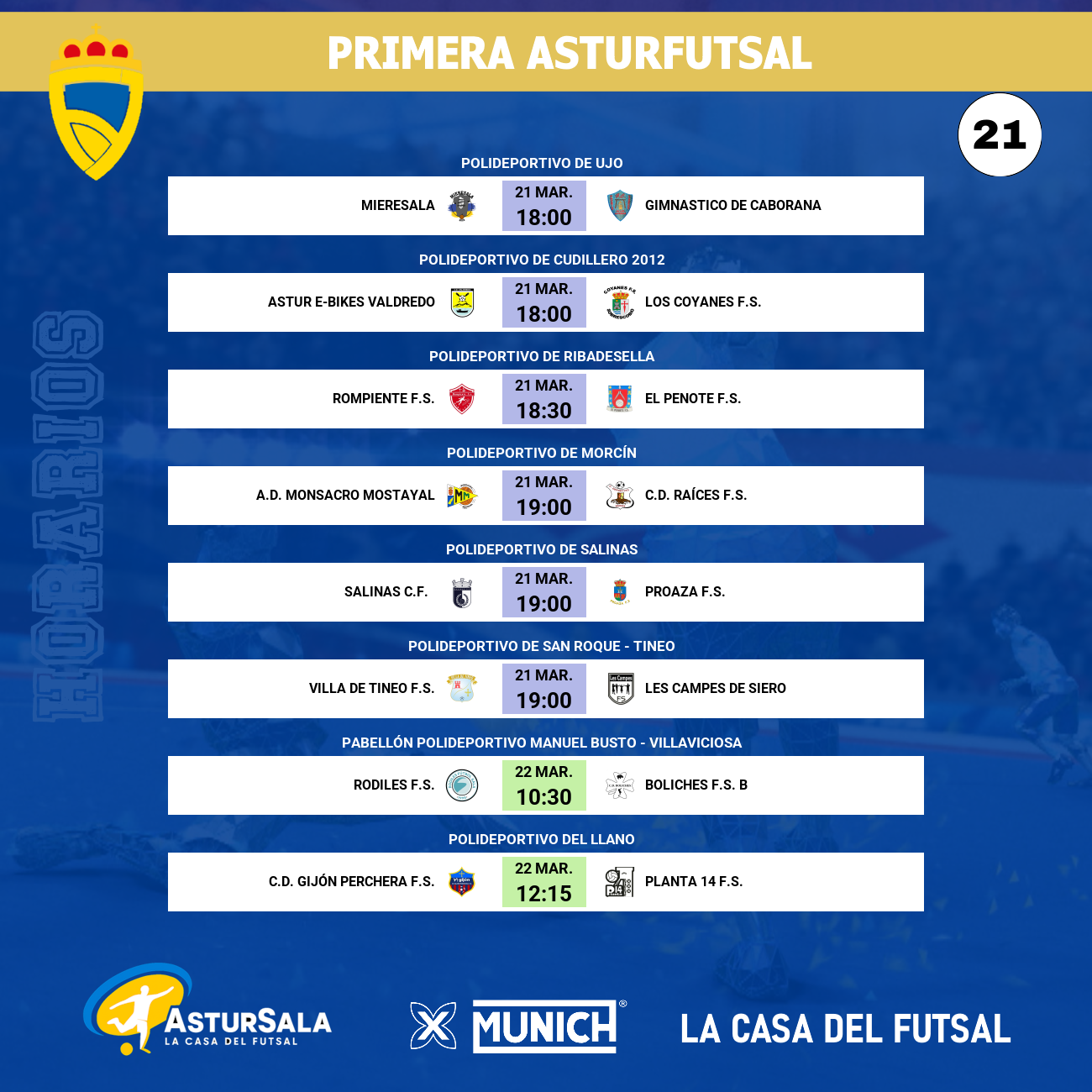 La Primera AsturFutSal llega a ese punto de la temporada donde los errores se pagan caros y las virtudes se consagran. Con el tramo final del campeonato asomando en el horizonte, la jornada 21 se presenta como un auténtico tablero de ajedrez. En la zona alta, el triunvirato formado por Salinas, Rodiles y Rompiente busca blindar su camino hacia la Tercera División, mientras que la zona media y baja arde con equipos dispuestos a dejarse el alma en el 40x20 por la supervivencia y el honor.