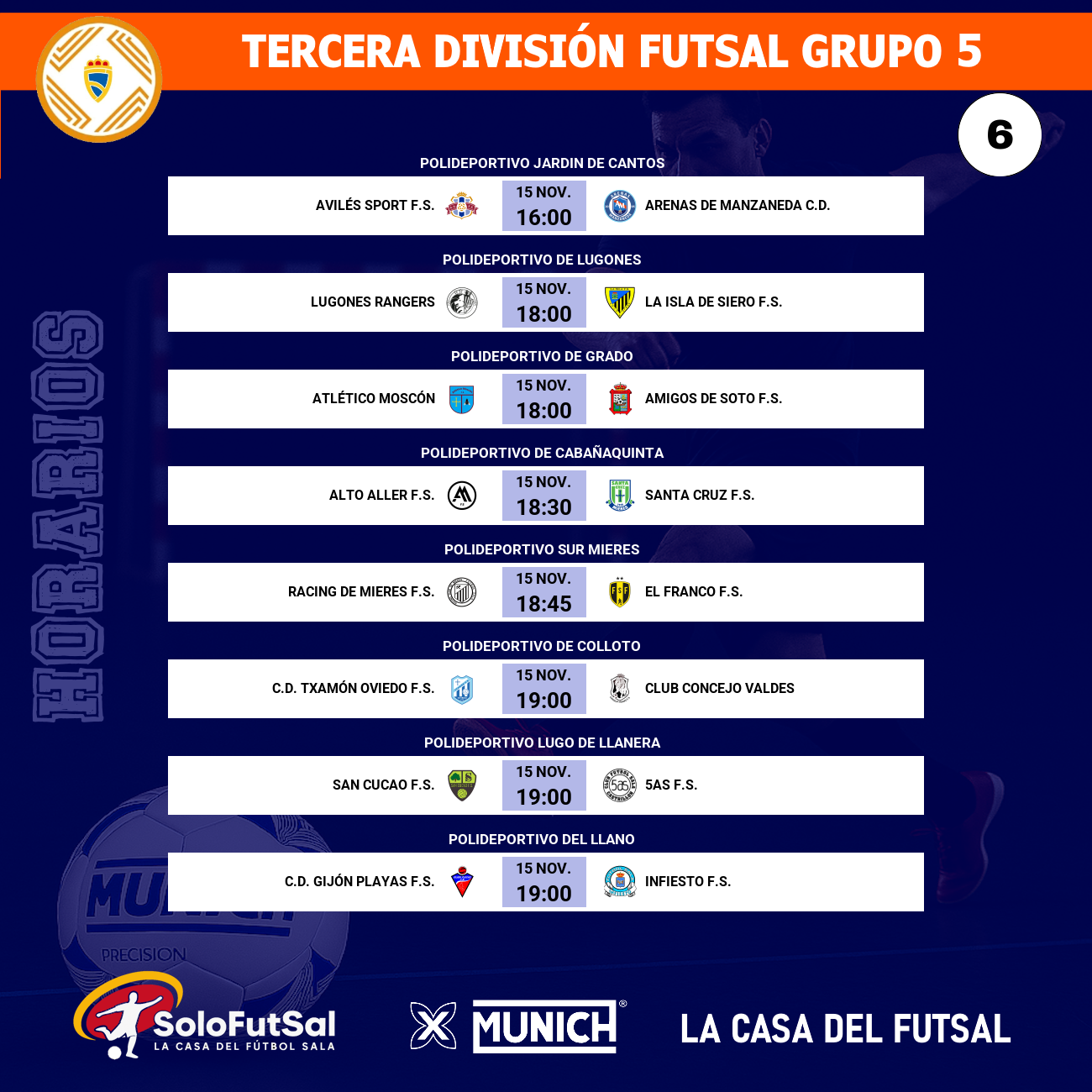 La sexta jornada promete emociones fuertes, con varios equipos luchando por consolidarse en la parte alta y otros buscando salir de la zona baja. El Grupo 5 sigue demostrando su competitividad y el alto nivel del fútbol sala asturiano.