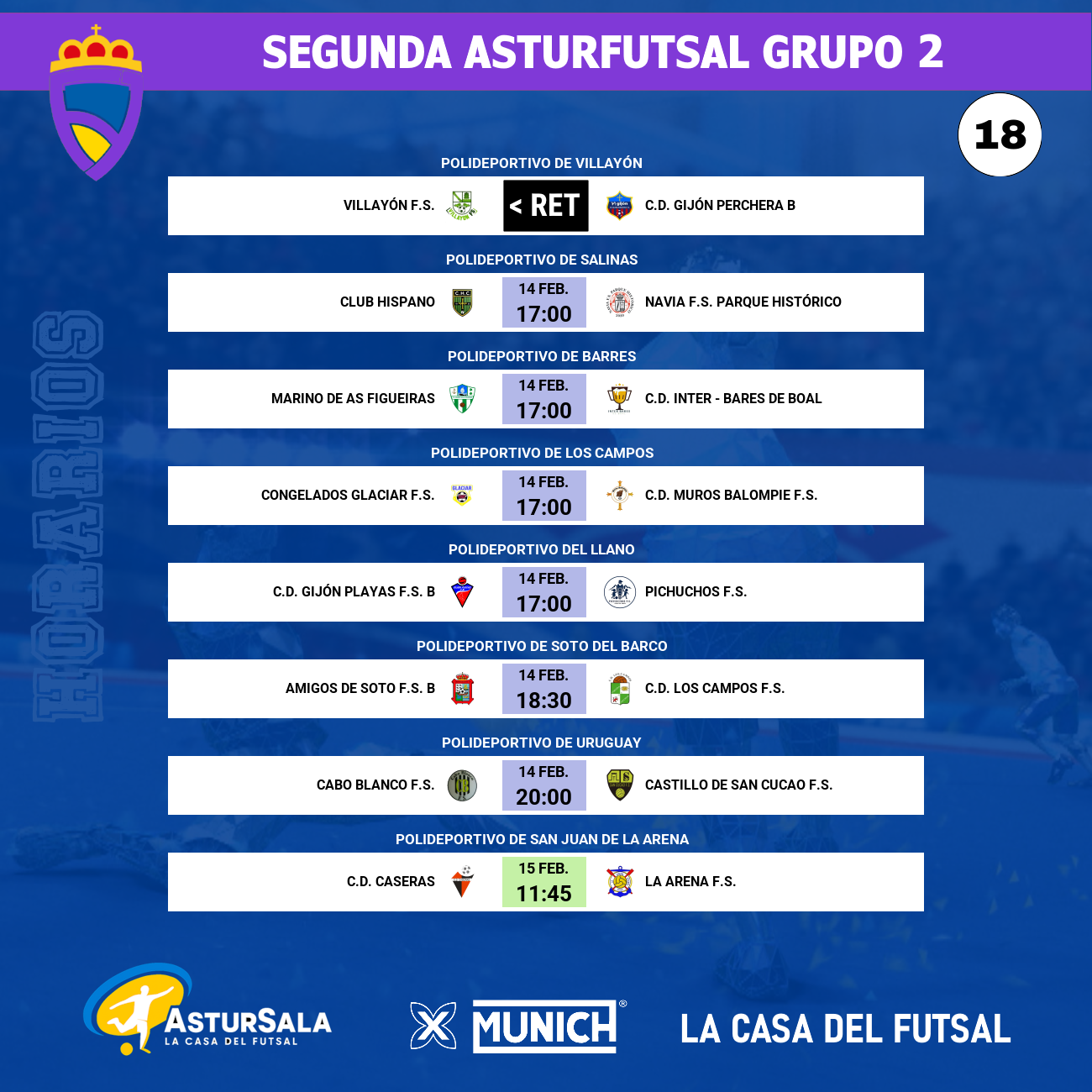 La Segunda AsturFutSal Grupo 2 entra en su fase decisiva este fin de semana. Tras una primera vuelta vibrante, la clasificación no podría estar más apretada. El Pichuchos F.S. defiende el liderato, pero siente el aliento de La Arena y de un C.D. Los Campos que protagoniza el choque estelar de la jornada. Cabe destacar que, debido a la retirada de la competición del Villayón F.S., el C.D. Gijón Perchera B disfrutará de una jornada de descanso forzoso, sin reparto de puntos ni disputa de partido.
