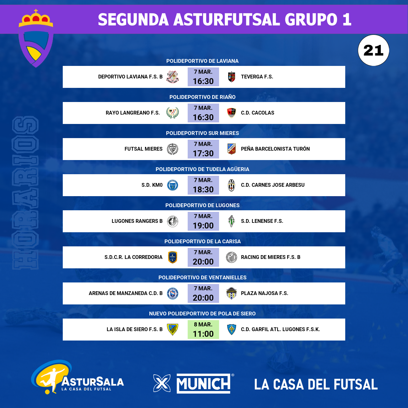 La agenda continuará a las 20:00 horas en el Polideportivo de La Carisa, donde la S.D.C.R. La Corredoria medirá sus fuerzas con el Racing de Mieres F.S. B. El conjunto local ocupa una meritoria octava posición con 32 puntos, y buscará sumar una nueva victoria frente a su público para mejorar los 7 puntos logrados en la reciente inercia competitiva.