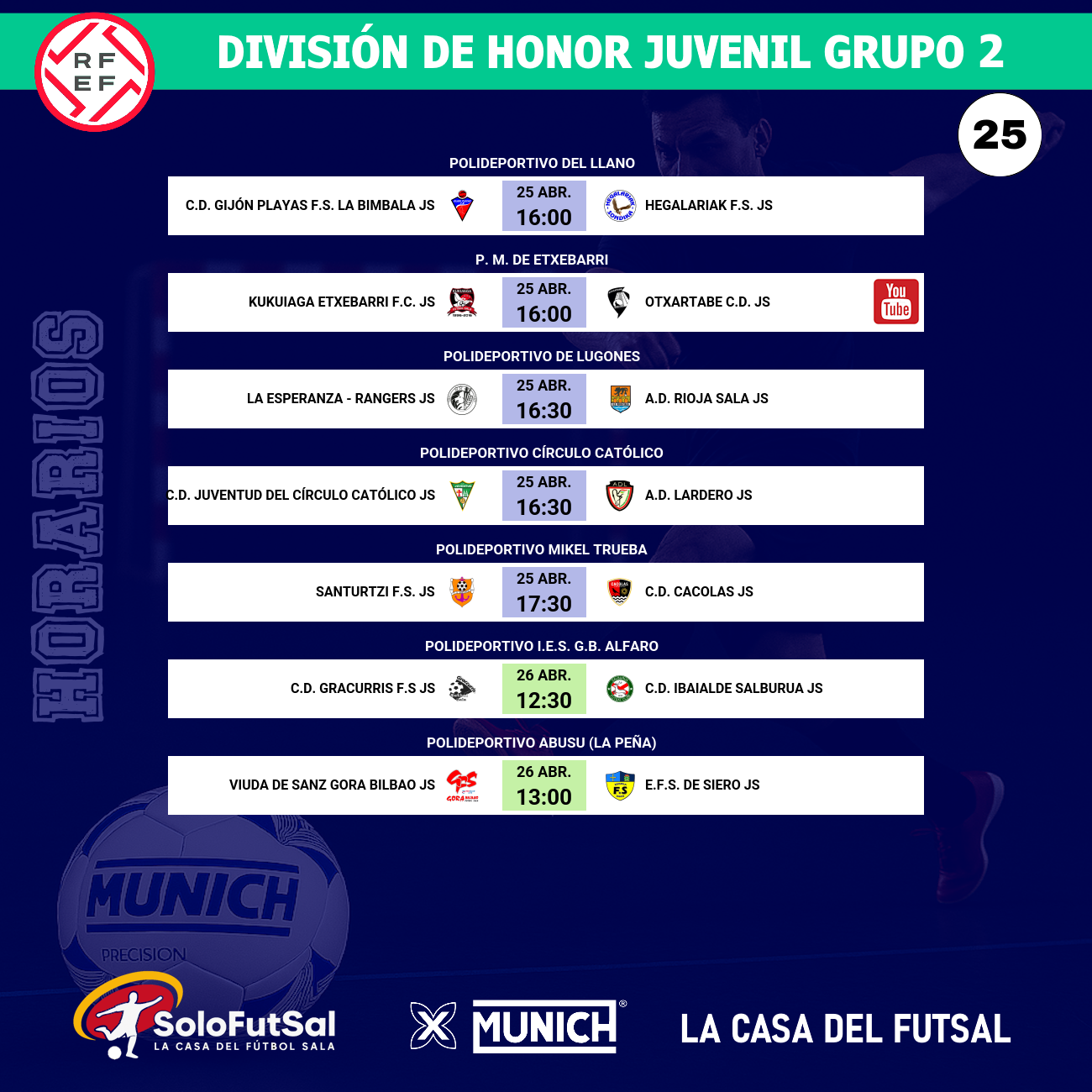 En Gijón, la jornada arrancará el sábado a las 16:00 horas en el Polideportivo del Llano. El C.D. Gijón Playas F.S. La Bimbala recibe la visita del Hegalariak F.S. en un duelo directo de la zona media de la tabla. Con 30 y 31 puntos respectivamente, ambos conjuntos están separados por una sola unidad y completamente a salvo de la quema del descenso.