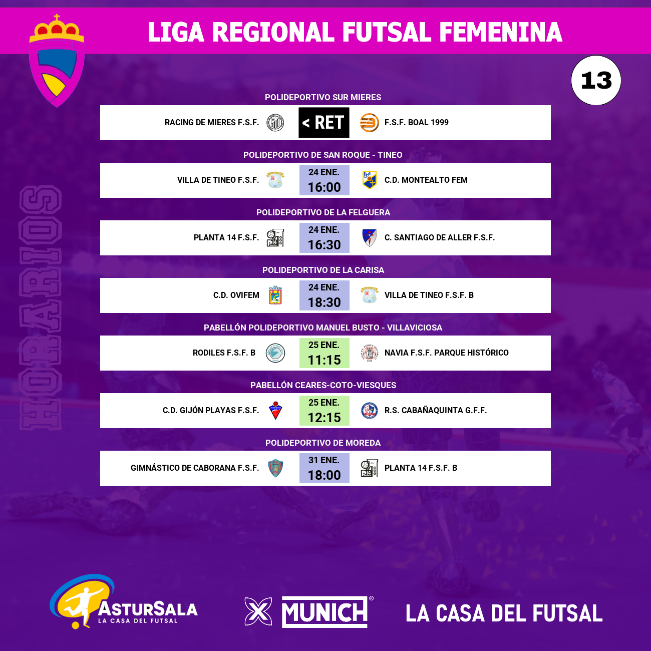 El partido de la jornada se disputará el sábado a las 16:30 horas en el Polideportivo de La Felguera. Se enfrentan el Planta 14 F.S.F. (4º) y el C. Santiago de Aller F.S.F. (3º), ambos empatados a 27 puntos en la clasificación. Es un duelo directo que podría definir quién se queda con la medalla de bronce momentánea y se consolida como la alternativa a los dos gigantes de la liga. Ambos equipos tienen el playoff entre ceja y ceja y llegan con dinámicas muy positivas.