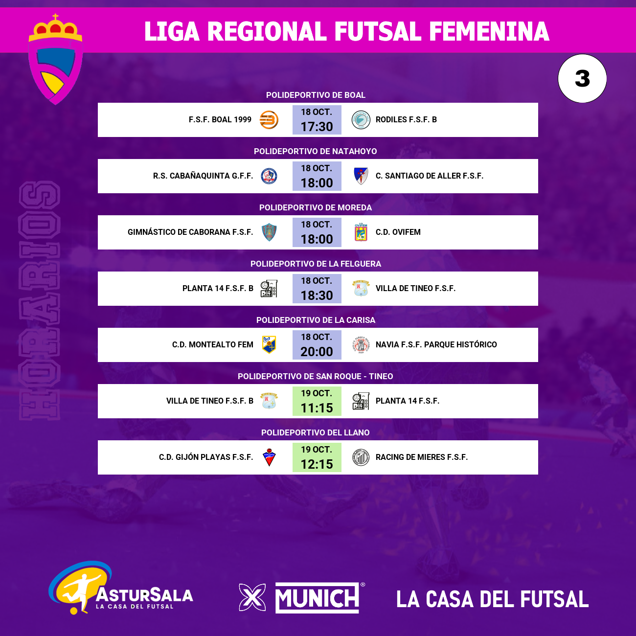 El C.D. Ovífem (7º) visitará al Gimnástico de Caborana F.S.F. (12º), en un duelo entre equipos que necesitan volver a la senda del triunfo. Por su parte, el C.D. Montealto Fem (11º) y la Navia F.S.F. Parque Histórico (14º), ambos sin puntos, se jugarán su primera victoria de la temporada en un partido clave para no perder estela.