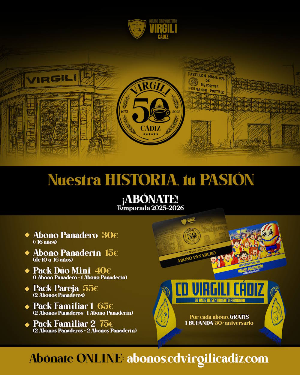El CD Virgili Cádiz ha presentado su campaña de abonados para la temporada 2025-2026 bajo el lema «Nuestra HISTORIA, tu PASIÓN». El Pabellón Ciudad de Cádiz volverá a ser el lugar de encuentro para la afición amarilla en un año en el que el club celebra su 50º aniversario.