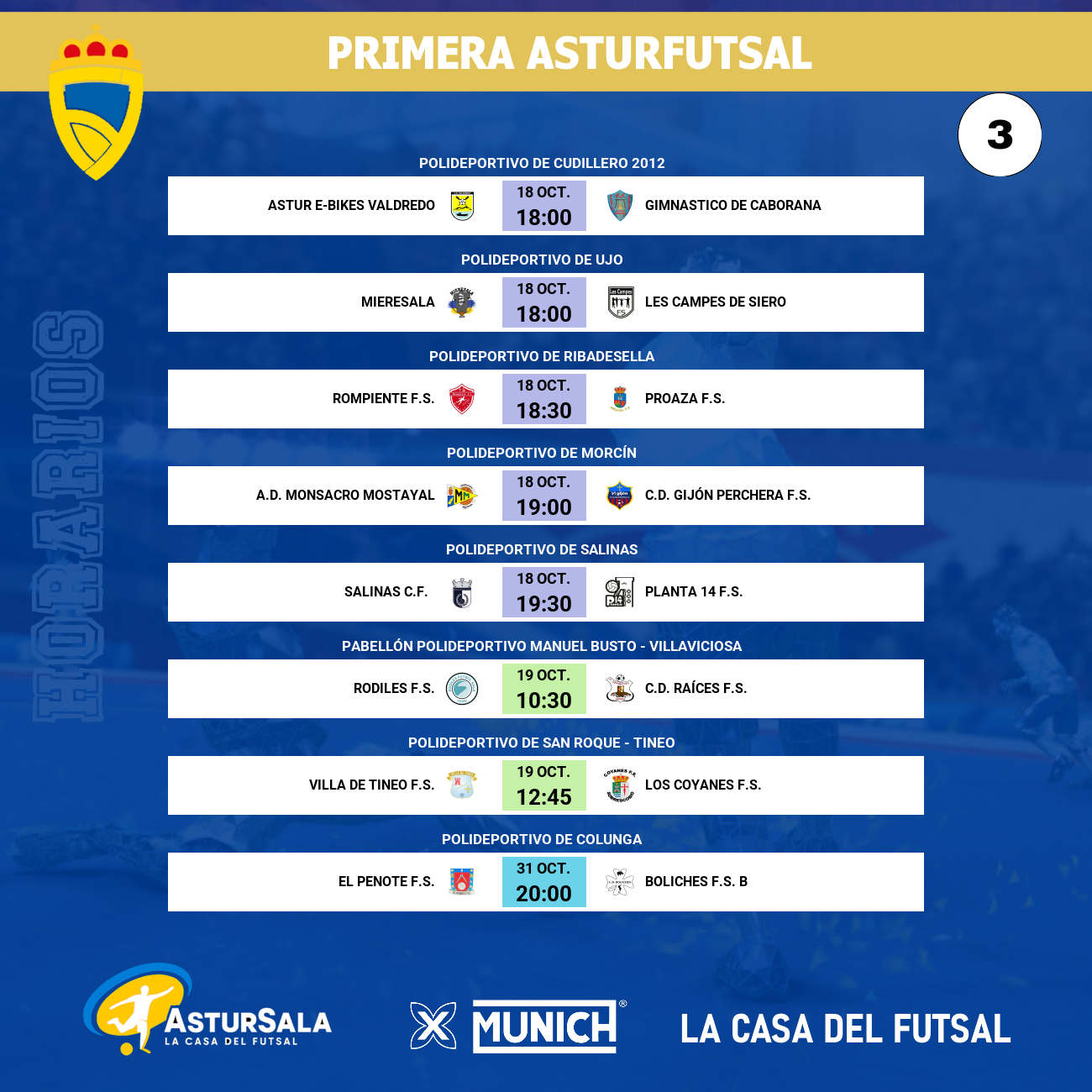 A.D. Monsacro Mostayal - C.D. Gijón Perchera F.S.: Un duelo entre dos equipos que necesitan enderezar el rumble. La A.D. Monsacro (15º), aún sin puntos, recibe a un Perchera (8º) que, a pesar de su gol average 0, ha demostrado tener punch ofensivo. Un partido clave para ambos.